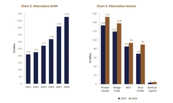 This chart from the Monetary Authority of Singapore (MAS) shows its total alternative assets under management (AUM) reached $478b in 2016.