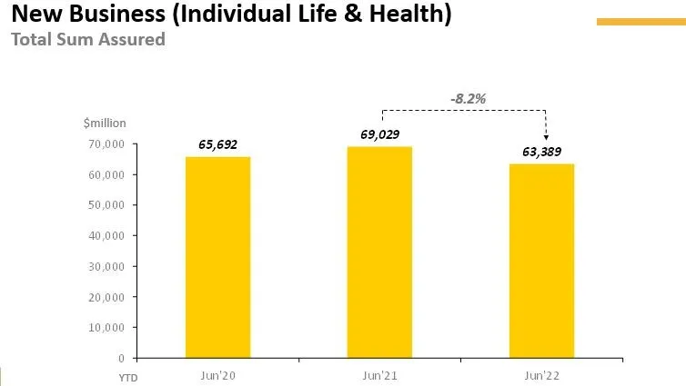 This chart from the Life Insurance Association of Singapore shows that new business premiums in the life and health insurance industry dropped by 8.2% to $63.4b in June compared to a year ago.
