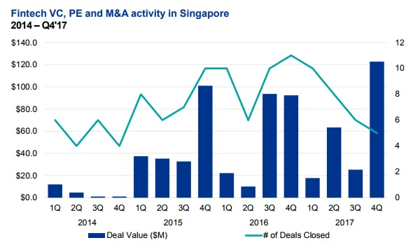 This chart from KPMG shows the number of fintech venture capital (VC) deals in Singapore plunged from 11 in 4Q2016 to merely five in 4Q2017.