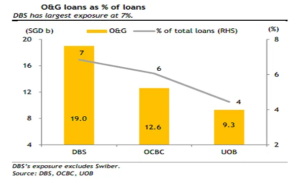According to Maybank Kim Eng, DBS has the largest exposure among Singapore banks at 7% of loans for the O&G sector.