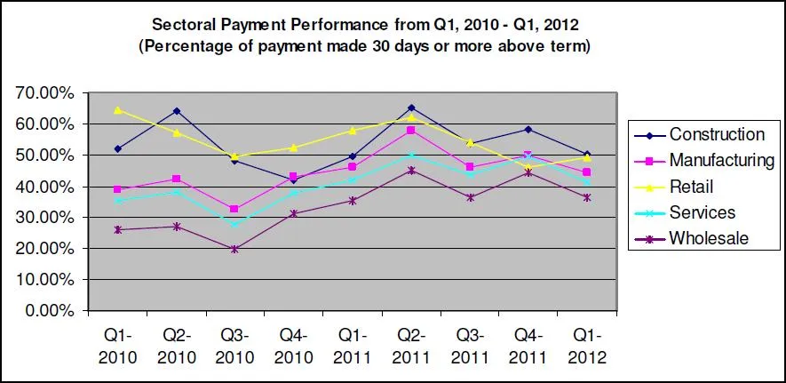 Despite slowing global trade flows and weaker external demand, the wholesale trade sector has maintained the lowest payment delays, down by 7.8 percentage points from the preceding quarter, to 36.4 per cent.