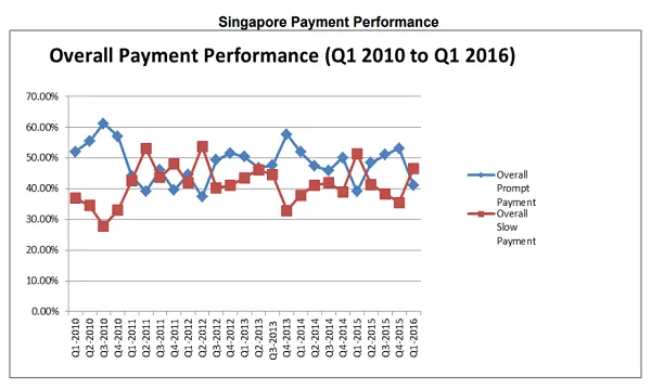 Singapore’s three-quarter streak of improvement in payment performance has come to an abrupt halt, as the Singapore Commercial Credit Bureau (SCCB) reports that payment performance has shown strong signs of weakening in 1Q16.