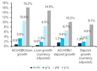 DBU loan growth was steady at 1.2% m/m, and was mainly driven by general commerce/trade finance +2.2% h/h (26% ytd).