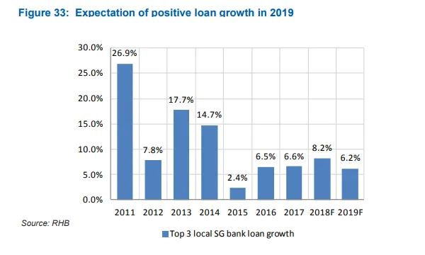 This chart from RHB shows that bank loan growth for Singapore’s big three is expected to ease down to 6.2% in 2019 from a forecast of 8.2% in 2019 amidst an impending economic slowdown.
