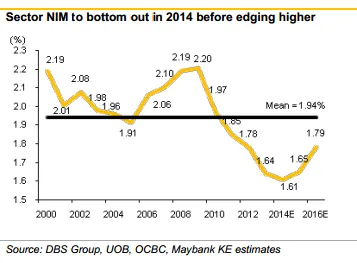 According to Maybank Kim Eng, after four consecutive years of consistent decline, it expects NIM to stay depressed throughout 2014, before strengthening in 2015.