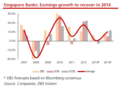 According to DBS, Singapore banks' earnings growth is predicted to recover in 2014.