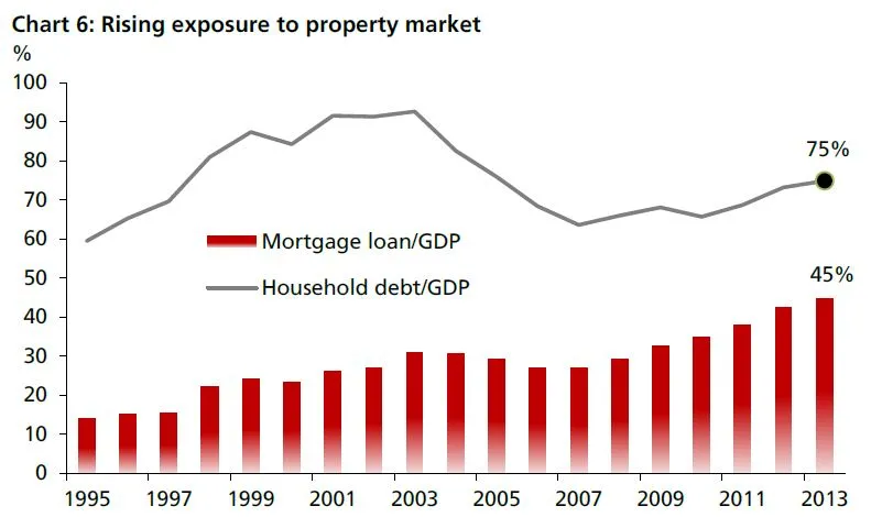 The household debt-to-GDP ratio rose to 75% in 2013 and appears to be continuing north. The mortgage loan-to-GDP ratio is at historical high of 45% while the LDR has continued to rise towards its historical peak almost a year after the introduction of the TDSR.