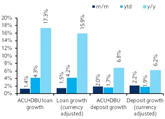 System deposits rebounded by 2% m/m in March, across both DBU (+1.5%) and ACU (+3% in US$ terms), following a contraction of 0.9% m/m in February. System loans rose 1.4% m/m, again led by ACU +2.6% m/m in USD terms, while DBU loans rose 0.6% m/m. In March, loan growth was driven by general commerce loans (+4.3% m/m) and non-housing retail loans (+4.3% m/m), despite the introduction of the Total Debt Servicing Ratio by the MAS last year. Non-housing retail loans are mainly secured loans for the local banks, according to our channel checks. Housing loan growth continues to slow (+0.4% m/m).