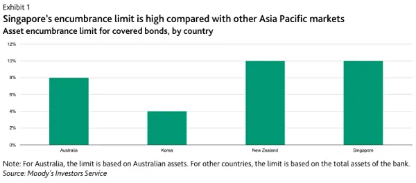 This chart from Moody’s Investors Service shows that Singapore’s encumbrance limit is high compared with other Asia Pacific markets. A high limit would slash refinancing risk if banks would lift issuance, the report said.
