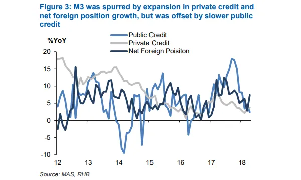 RHB Research forecasts to M3 accelerate to +6.2% in 2018 from 4.1% in 2017. "This is premised on a strong SGD, stable economic prospects, and pick-up in property transactions," it said.