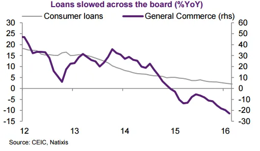 This chart from Natixis shows the unabated decline in both consumer and business loan growth, a leading indicator of economic activity.