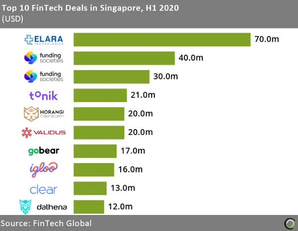 This chart from Fintech Global shows the top 10 fintech deals in Singapore for the first half-year of 2020. All in all, the top 10 pooled together an aggregate $259m, comprising 73.8% of overall investments in the country during the period.