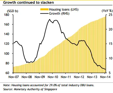 “We expect slower housing loan growth in 2015 with drawdowns for newly completed homes to feed loan growth.We expect loan growth to average 9% in 2015 for our banks, relatively unchanged from our 9.3% projection for 2014. Given the pace of the slowdown locally, there is a risk that our 12% business loan growth projection for 2015 may not be met,” stated Maybank Kim Eng.
