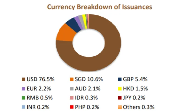 This chart from the Monetary Authority of Singapore shows that US dollars remained as the primary currency of issuance, as it accounted to 76.5% of total issuance volumes in 2017.