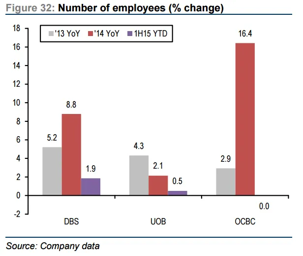 Headcount at DBS grew by 1.9% year-to-date, much lower that 8.8% for the whole of 2014. Meanwhile, UOB's headcount grew by a measly 0.5% YTD, compared to 2.1% in the entire 2014.