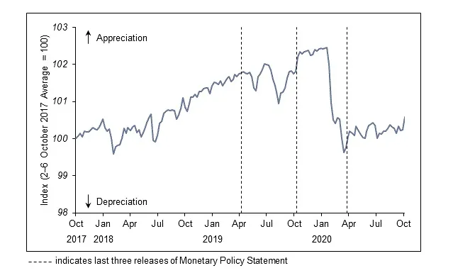 In its April 2020 Monetary Policy Statement (MPS), Singapore set the rate of appreciation of the S$NEER policy band at zero percent per annum, starting at the then-prevailing level of the S$NEER. There was no change to the width of the policy band.