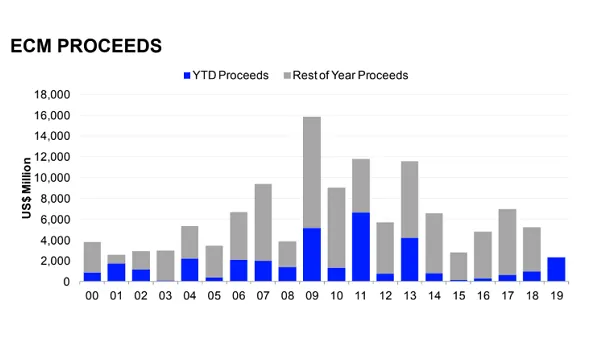 The strong quarterly gains were driven by the US$1.5b American depository share follow-on offering from game developer Sea Ltd in New York which represents the biggest equity offering from a Singaporean company so far in 2019. The follow-on offerings of Keppel Infrastructure Trust, Wave Life Sciences, Mapletree Industrial Trust and Cromwell European REIT also made it to the top ECM deals for the quarter.