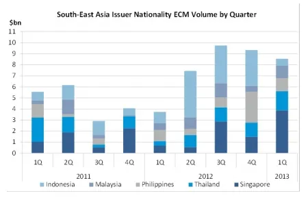 South East Asia ECM reached $8.7bn in 1Q 2013, up 120% from $4.0bn raised in the same period last year, but down 7% on 4Q 2012 ($9.4bn), according to Dealogic.