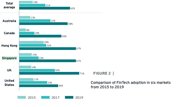 Fintech adoption amongst Singapore consumers widened to 67% in 2019 from 23% in 2017 and 15% in 2015, according to the EY Global FinTech Adoption Index 2019.