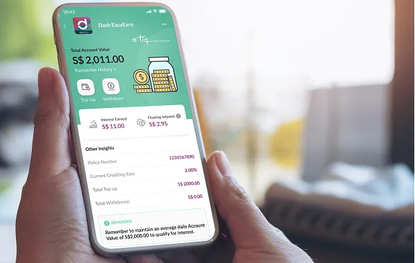 The new Dash EasyEarn insurance savings offers 2% per annum returns for the first policy year, designed for investors who want to start saving regularly but who may be concerned about cash flow. The service is open to eligible users in Singapore and is underwritten by Etiqa Insurance.