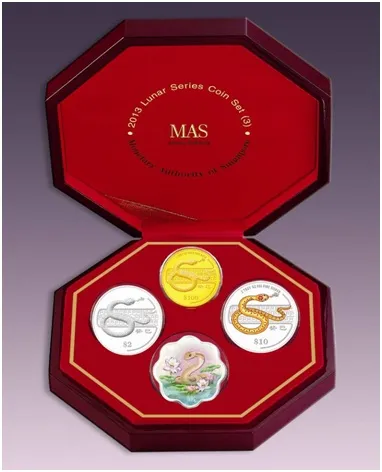 The coins launched by Monetary Singapore are part of the third Chinese Almanac Coins Series. The image of the snake is integrated with ancient Chinese seal characters in a design that combines tradition with modernity.