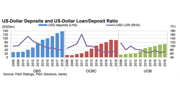 Banks in Singapore have significant US-dollar exposure which represent 26% and 31% of total loans and deposits as of end-March following active regional expansion, according to Fitch Solutions.