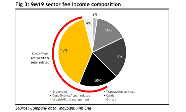 Almost 60% of Singapore banks’ fee income in the first nine months of 2019 originated from wealth and retail segments, according to a report by Maybank Kim Eng.