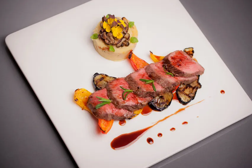 For the main, diners may opt for either a meat- or fish-based dish. The perfectly Roasted, succulent “Cote de Beouf” Tagliata style with Bacon & Mash served with fresh, Grilled Seasonal Vegetable and Barolo Reduction presents a mouth-watering choice, as does the luscious Branzino with aromatic Malt Cider Glazed Shallots accompanied by creamy Potato Duchess mounds on a clear Bouillabaisse Broth.