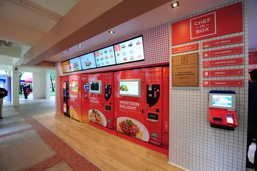 The Chef-in-Box VendCafé features six different types of machines, including the Chef-in-Box hot food vending machines, a highlight of the Chef-in-box VendCafé, as an innovative solution to a growing community issue. That is, Singapore's manpower crunch, which leads to some establishments being unable to operate round the clock to cater to consumers' needs.