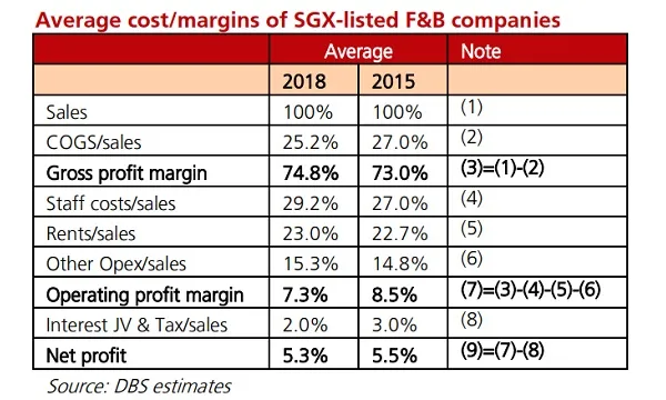 This chart from DBS Group Research reveals that the average net profit of SGX-listed F&B companies rose by 5.3% in 2018, although slightly lower 5.5% average in 2015.