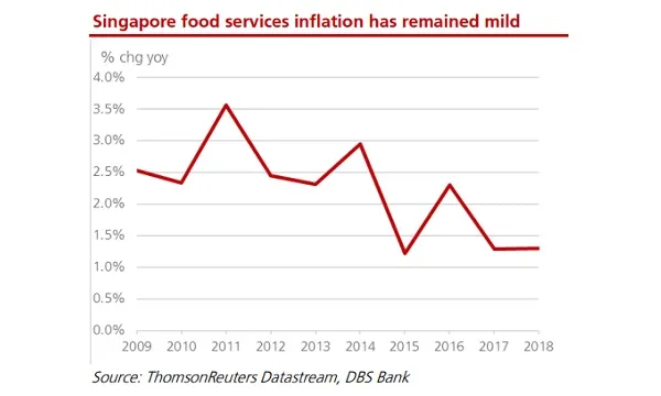 This chart from DBS Group Research shows that food inflation hovered at 1-4% in recent years and averaged 2.2% over the past 10 years.