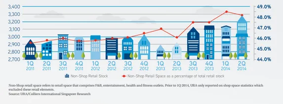 Colliers adds that perhaps a more telling statistic is the ratio of shop space to non-shop space (where a significant proportion is estimated to comprise F&B outlets). In all of Singapore, shop space accounted for 61.0% of all retail space, with F&B, entertainment and health and fitness outlets taking up the remaining 39.0% in 2Q 2014. However in the Downtown Core, shop space formed a substantially lower proportion of 51.8%, while non-shop space made up 48.2% during the same period.
