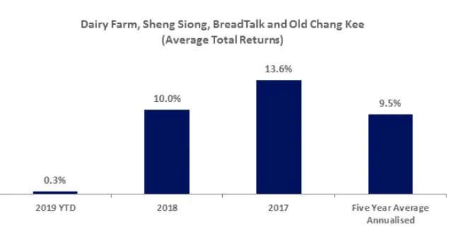 In fact, the companies' positive stock performance stands in contrast to the average and median decline of their food retailing peers across Asia Pacific in 2018 with Dairy Farm leading the pack with a 20.5% gain to BreadTalk recording a 1.6% decline.