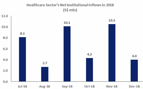 This chart from the Singapore Exchange (SGX) shows that the healthcare sector which is typically regarded as a defensive segment saw six consecutive months of net inflows by institutions investors, racking in a total of $39.7m in H2 2018.