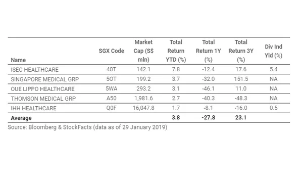 ISEC Healthcare topped the list with returns of 7.8% YTD. It was followed by Singapore Medical Group, OUE Lippo Healthcare, Thomson Medical Group, and IHH Healthcare with returns of 3.8%, 3.1%, 2.7%, and 1.7% respectively. “This brings their one-year and three-year total returns to -27.8% and +23.1% respectively,” SGX said.