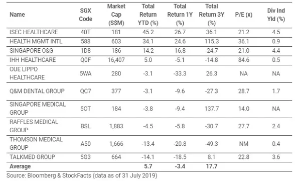 The three best performers amongst the listed healthcare firms, ISEC Healthcare (45.2%), HMI (34.1%) and Singapore O&G (14.2%), have an average total return of 31.2% over the first seven months of 2019, according to SGX.