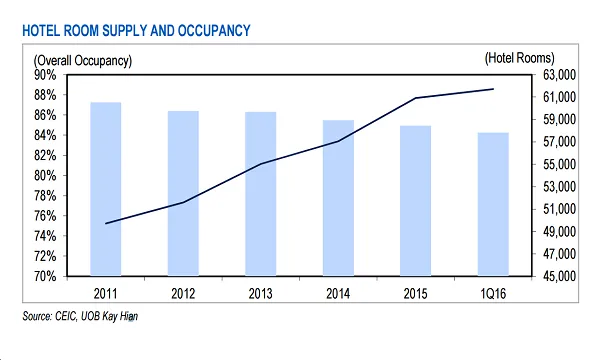 Accordingly, in the first quarter of 2016, room rates slipped 2.8% YoY while occupancy remained stable at 84.3% thanks to a spike in visitor arrivals cushioning 2H15's supply glut at the expense of rates charged by hoteliers.