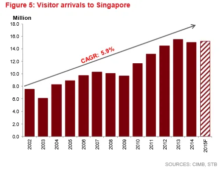 According to a report by CIMB, Chinese tourist arrivals are expected to grow by high-single-digit to double-digit in 2015,mainly due to 1) the low base in 2014, and 2) promotional activities by Singapore Tourism Board (STB) to woo the Chinese to visit Singapore on their own as a mono-destination.