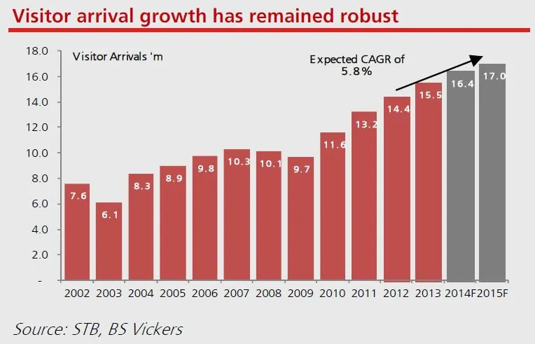 The Singapore Tourism Board (STB) has set a target of 16.3m - 16.8m visitor arrivals for 2014, representing a growth rate of 5 - 8% on a y-o-y basis.