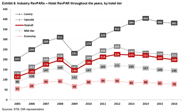 This chart of OCBC paints the picture of the gradual slump of overall hotel RevPARs. After peaking at $226 in 2012, RevPARs have slowed down gradually to $199 in 2016.