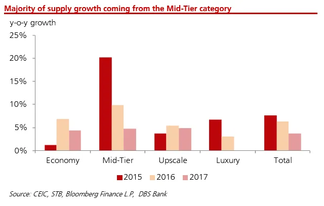 DBS also noted that majority of new supply this year will come from the mid-tier category, with 40% of rooms coming from this segment.