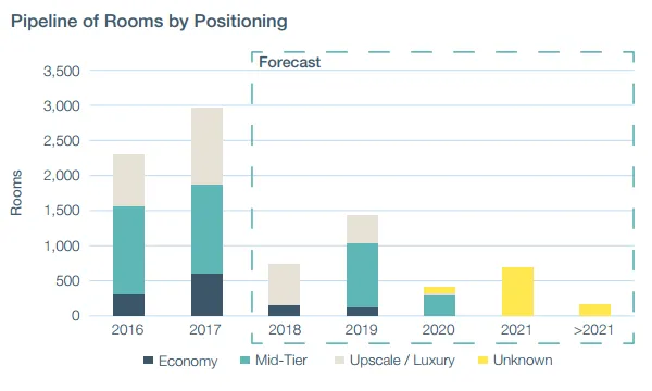 This chart from Savills Research shows that 737 hotel rooms are expected to come online 2018, a significant decrease from nearly 3,000 rooms launched in 2017.