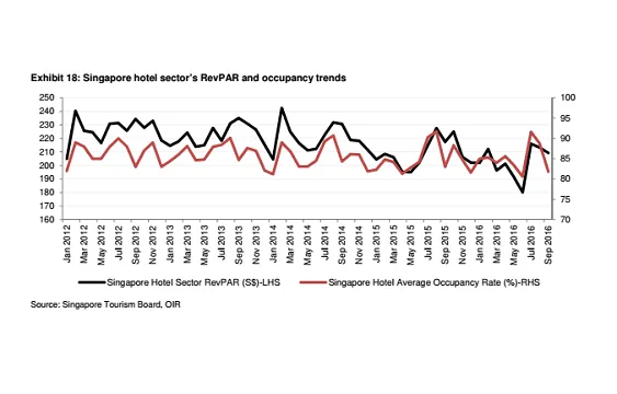"Overall visitor arrivals are up 9.4% for 9M16. There was also a robust 12% improvement in tourism receipts to S$11.6b for 1H16, underpinned by higher expenditure in shopping, accommodation and F&B. In terms of hotel statistics, occupancy was stable at 85.0% from Jan-Sep 2016 (-0.1 ppt), but RevPAR was down 3.3% to $201.90," OCBC said.