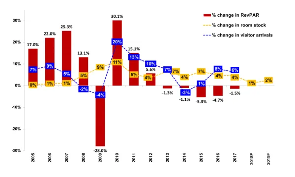 RevPAR growth was steady in 2005 to 2007, but the change in visitor arrivals dipped from 7% to 5% as Asia approached the Credit Crisis.