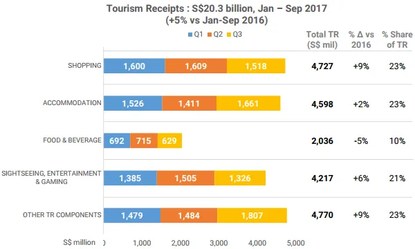 This chart from the Singapore Tourism Board (STB) shows that in Q1 to Q3, shopping took up 23% or $4.73b of tourists' expenses whilst in the city state.