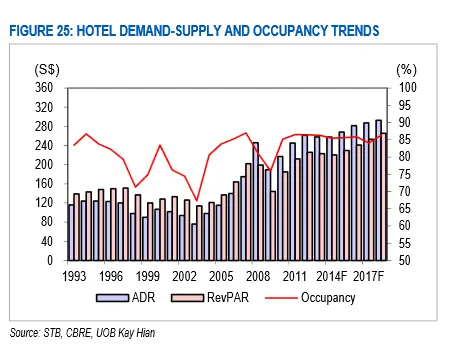 According to a report by UOB Kay Hian, revPAR should stabilise and gradually increase 3-5% over the next four years. Occupancy levels will also remain high at about 85%.
