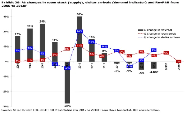According to OCBC, in 2016, AOR, ARR, and RevPAR grew by -0.9 ppt, -3.6%, and -4.6% YoY, respectively. This compares to the 5.3% decline in RevPAR for the whole of 2015.