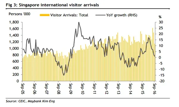 According to Maybank KimEng, foreign visitors at the two integrated resorts have been weak and countries like the Philippines have had some success in wresting market share in the Chinese gaming segment. The 2016 Singapore Grand Prix also saw the poorest turnout since its inception in 2008.
