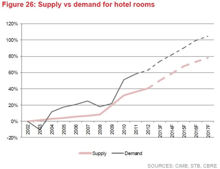 According to CIMB, the supply of hotel room nights available in Singapore has grown at a CAGR of 3.7% in 2007-13. Over the next four years, the new supply of hotel rooms is expected to be high at 9,432 rooms, translating into c.17% of total current stock.
