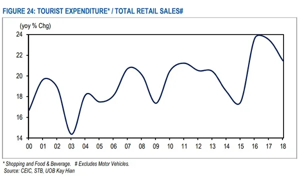 This chart from UOB Kay Hian shows spending by tourists over the past 18 years and projects that the sector will account for 21.5% of total retail sales by end-2019.